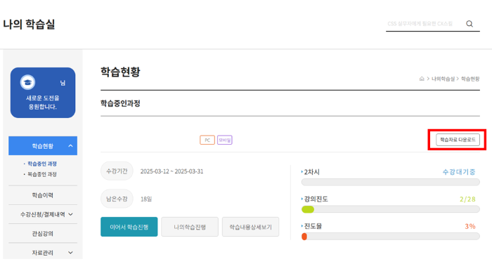 나의 학습실에서 해당 과정 내부에서 다운로드 등 확인하실 수 있습니다.