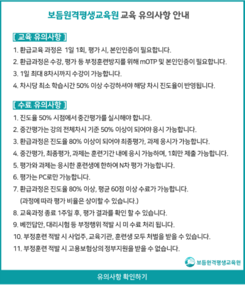 [ 교육 사전 안내 ] 교육 개강 시 필요한 사항을 정리하여 여러분의 사업장에 보내드리고 있으며, 중요 사항은 숙지 후 교육에 임하여 주시기 바랍니다. - 개강일은 여러분의 사업주와 지정된 개강일에 시작이 되며, 회사와 계약서 접수 후 회사 교육담당자를 통하여 안내를 드립니다. - 여러분의 훈련에 필요한 정보는 회사에서 일괄 회원가입 및 수강신청 후 교육 시작일 당일에 전원 수강정보(로그인계정,접속방법 등)를 문자나 이메일로 보내드리고 있습니다.
