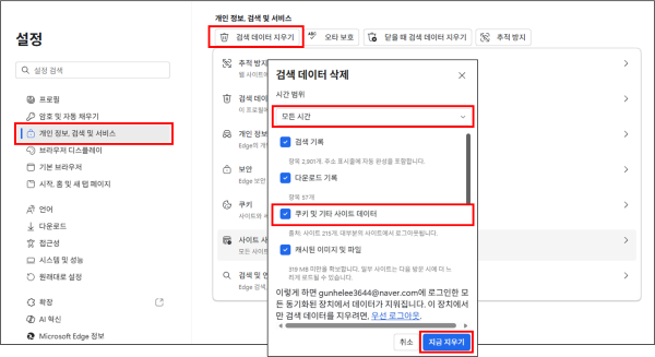 나. 엣지(Microsoft Edge) 브라우저 사용 시 엣지창 상단 우측 점 3개 눌러 설정 > 개인정보, 검색 및 서비스 > 검색 데이터 지금 지우기(지울 항목 선택) > 시간 범위 : 모든 시간 > 쿠키 체크 후 삭제 버튼