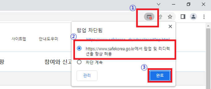 2. 크롬(Chrome) ① 주소창에 있는 팝업차단 아이콘을 클릭해 주세요. ② "https://www.safekorea.go.kr의 팝업 및 리디렉션을 항상 허용"을 체크합니다. ③ 완료 버튼을 클릭합니다.